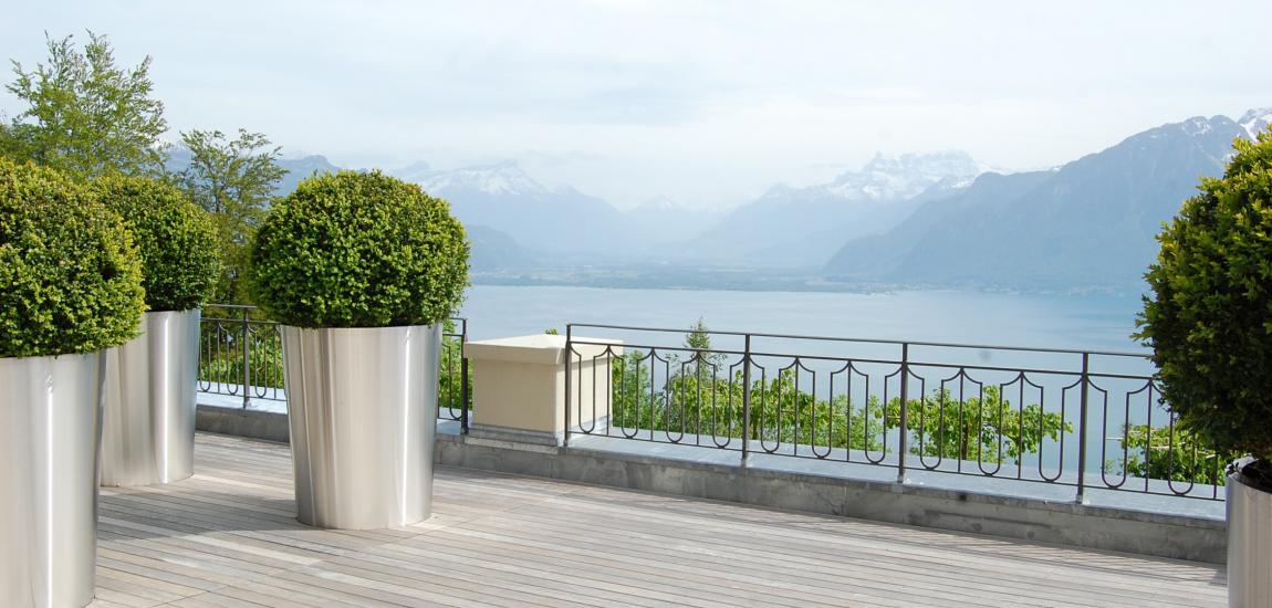 Aménagement des extérieurs des jardins et des terrasses de l'hôtel du Parc du Mont-Pèlerin. Télécharger la fiche de chantier : Plaquette - Hôtel du Mont Pèlerin.pdf