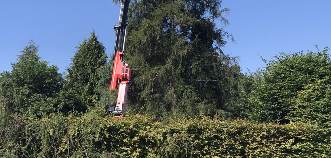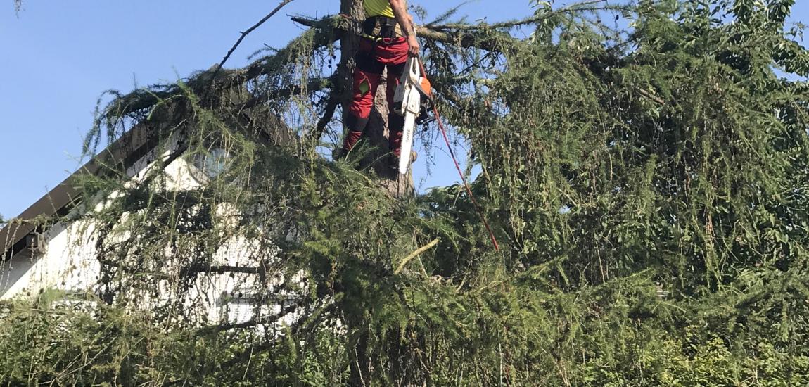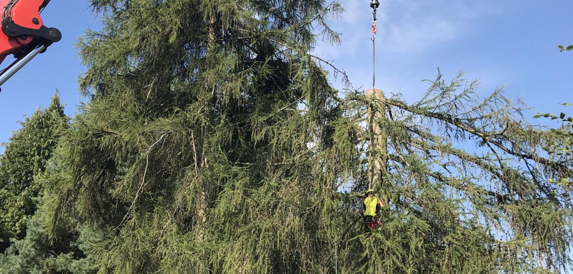 Réalisation d'un abattage par démontage progressif de deux Mélèzes à l'aide d'un camion grue et éclaircissage d'un Pin.