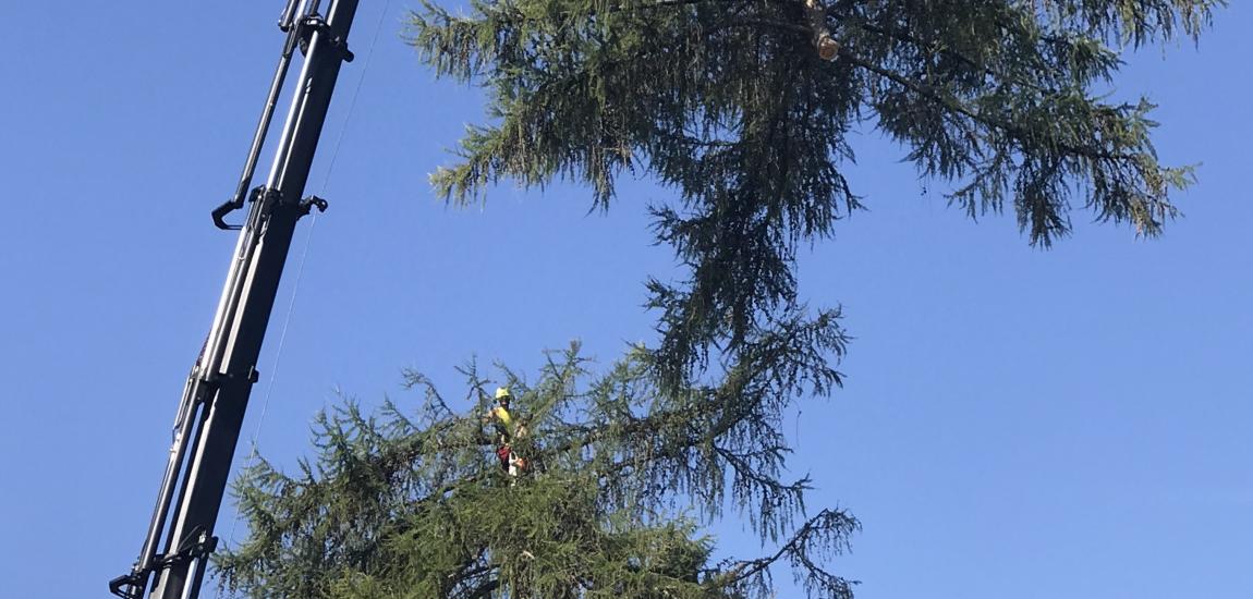 Réalisation d'un abattage par démontage progressif de deux Mélèzes à l'aide d'un camion grue et éclaircissage d'un Pin.