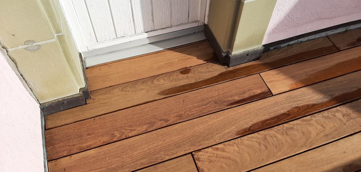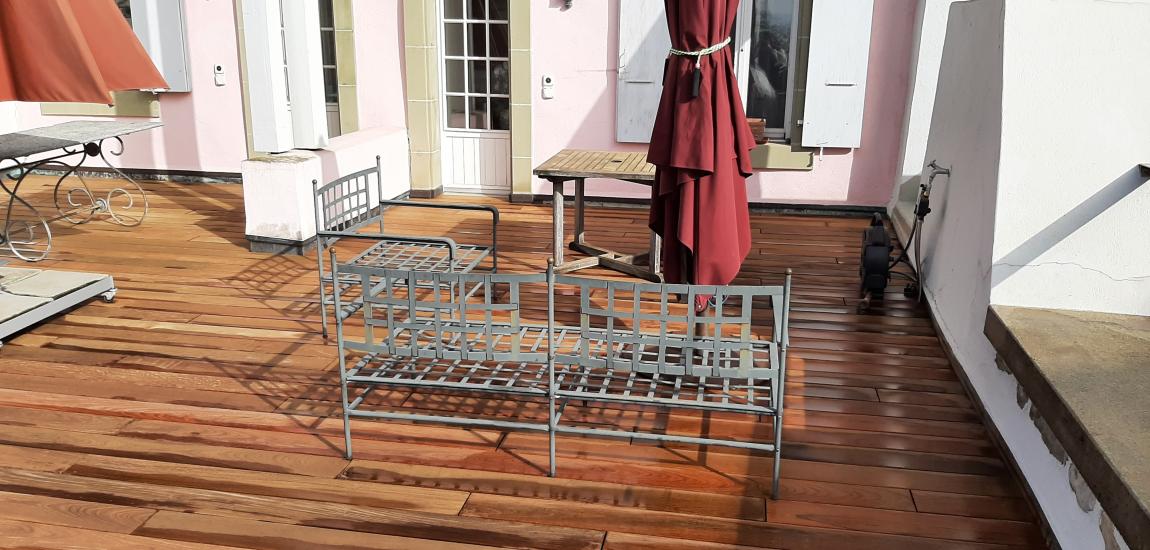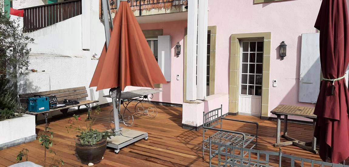 Cette terrasse initialement en dallettes roses, à changer de visage grâce à l'utilisation du bois exotique.